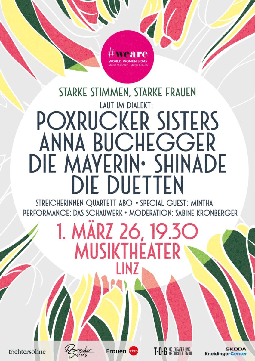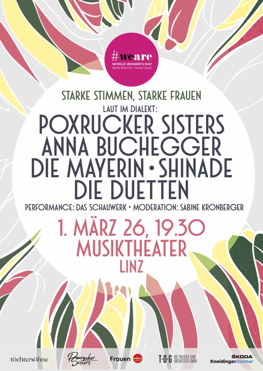 Unter dem Motto „Laut im Dialekt“ stehen auf der Bühne: Anna Buchegger, Shinade, Die Mayerin, Die Duetten, das Ensemble Das Schauwerk und die Poxrucker Sisters selbst. Durch den Abend führt Sabine Kronberger. Ein Konzerterlebnis voller Energie, Emotion und Inspiration – zum Weltfrauentag 2026.